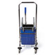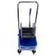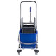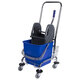 Представляет собой ведро объемом 25 л с механическим отжимом, установленное на металлической основ. База изготовлена из качественного металла, а инвентарь – из пластика. Тележка выполнена в двухцветном исполнении: синий и серый. Колеса позволяют перемещаться в произвольном направлении. Имеются защитные диски на колесах.