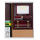 Все предметы изготовлены из дерева цвета "красное дерево" с золотистой фурнитурой. Набор упакован в подарочную коробку, а также дополнительно в защитный гофрокорб для транспортировки.