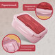 Объём ланч-бокса – 1400 мл, что оптимально для полноценного обеда. Он состоит из двух уровней: первый (700 мл) представляет собой большое отделение для основного блюда, а второй (700 мл) разделён на 3 секции и подойдёт для сэндвичей, закусок, десертов или салата. Благодаря перегородкам продукты не смешиваются между собой. Таким образом, ланч-бокс универсален: его можно использовать как для одного блюда, так и для комбинации из разных блюд.