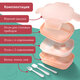 Объём ланч-бокса – 1900 мл, что оптимально для полноценного обеда. Он состоит из трёх уровней: нижний (950 мл) с двумя отделениями подойдёт для основного блюда, например, гарнира и мяса; средний (750 мл) с четырьмя отсеками идеален для салатов, сэндвичей, снеков, десертов и соусов; дополнительная верхняя секция (250 мл) — предназначена для хранения столовых приборов, которые идут в комплекте, и подойдёт для размещения ломтика хлеба или нескольких хлебцев. Благодаря продуманной конструкции блюда сохраняют вкусовые качества и не смешиваются между собой.