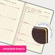 Внутренний блок включает 64 листа тонированной бумаги плотностью 70 г/м2. Благодаря стандартному формату А5 (145х215 мм) еженедельник удобно использовать как в офисе, так и на выездных деловых встречах. Твердая обложка темно-коричневого цвета, стилизованная под кожу крокодила, подходит для горячего тиснения. Срез еженедельника покрыт золотой фольгой, что придает ему особый шарм.