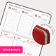 Срез и форзац еженедельника окрашены на контрасте с цветом обложки, что придает ему особый шарм. Дополнением является закладка-ляссе, с помощью которой при необходимости можно быстро открыть еженедельник на нужной странице. В конце внутреннего блока есть 7 страниц для записей и заметок. Обширный справочный материал расширяет функциональность еженедельника.