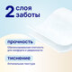 Двухслойная туалетная бумага белого цвета с тиснением. Отличается мягкостью, обладает повышенной прочностью во влажном состоянии. Расход в 2 раза меньше обычной бумаги.