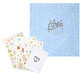 В набор входят 3 листа стикеров для мальчиков, открытка с ножками в подарок, а также маленький конвертик для мелочей на внутренней стороне обложки, куда можно поместить бирку из роддома, снимок УЗИ, локон ребенка.