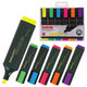 В наборе шесть неоновых цветов: желтый, зеленый, голубой, розовый, оранжевый, фиолетовый. Плоская форма корпуса, диаметр которого 25 мм. Скошенный наконечник имеет толщину линии письма от 1 до 5 мм, что обеспечивает удобство при работе с текстом, напечатанным мелким шрифтом, или таблицами. Благодаря особой водной основе чернил текстовыделители не высыхают без колпачка в течение 8 часов. Текстовыделители обладают экономным расходом чернил, при этом длина линии письма достигает 300 метров. Чернила быстро впитываются и тем самым предотвращают размазывание в процессе использования. Светоустойчивые чернила не выцветают даже на открытом солнце. Цвет клипа соответствует цвету чернил.