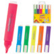 В наборе шесть неоновых цвета: желтый, зеленый, розовый, голубой, фиолетовый и оранжевый. Плоская форма корпуса, диаметр которого 18 мм. Неоновый цвет позволяет ярко выделить важное в тексте. Скошенный наконечник имеет толщину линии письма от 1 до 4 мм, что обеспечивает удобство при работе с текстом, напечатанным мелким шрифтом, или таблицами. Благодаря особой водной основе чернил текстовыделитель не высыхает без колпачка в течение 8 часов. Текстовыделитель обладает экономным расходом чернил, при этом длина линии письма достигает 350 метров. Чернила быстро впитываются и тем самым предотвращают размазывание в процессе использования. Светоустойчивые чернила не выцветают даже на открытом солнце. Цвет колпачка и корпуса соответствует цвету чернил.