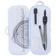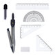 - Комплектация: линейка, пенал пластиковый, пенал с запасным грифелем, стирательная резинка, транспортир, треугольник 30°60°, треугольник 45°, циркуль