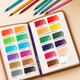 В наборе 24 цвета: черный, темно-синий, синий, голубой, салатовый, зеленый, темно-зеленый, болотный, серо-зеленый, желтый, оранжевый, темно-оранжевый, персиковый, фуксия, розовый, красный, темно-красный, бордовый, песочный, серый, светло-серый, фиолетовый, темно-коричневый, коричневый.