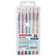 Ручка имеет круглый прозрачный корпус и рифление в зоне захвата для удобства письма. Сменный стержень длиной 130 мм со стандартным наконечником позволит использовать ручку максимально долго. Диаметр пишущего узла, равный 0,7 мм, создает линию письма, равную 0,5 мм. Набор включает гелевые ручки из 6 различных цветов чернил с эффектом "металлик": синий, красный, фиолетовый, зеленый, серебристый, желтый. Рекомендован для детского творчества.