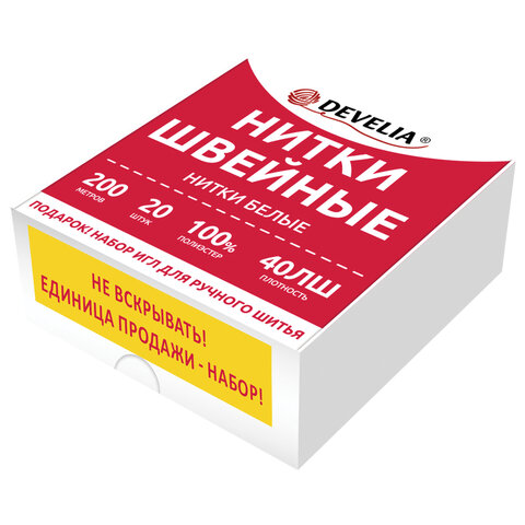 Нитки швейные 40 ЛШ, 200 м, полиэстер, НАБОР 20 шт., белые, в ПОДАРОК иглы, DEVELIA (Девелиа), 609621