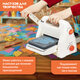 В набор входят: • машинка для вырубки и тиснения формата А5 (155 мм – ширина рабочей части) – 1 шт., • стандартная платформа для вырубки 153х330х16 мм – 1 шт., • мат для вырубки 153х330х3 мм – 1 шт., • адаптер для толстых ножей 153х330х2 мм – 1 шт., • папка (клише) для тиснения – 1 шт., • набор фигурных ножей для вырубки и тиснения – 1 шт., • нож для вырубки (толстый) – 1 шт., • листы цветной бумаги 15х15 см – 8 шт., • инструкция по применению – 1 шт. Машинка работает без батареек. Присоски на ножках машинки позволяют надежно установить её на любой плоской поверхности. Раскладывающиеся боковые грани можно использовать в качестве контейнера для хранения ручки машинки и других мелких элементов. Инструменты, входящие в набор, позволят начать работу с машинкой сразу после покупки – в комплекте есть всё необходимое, включая даже листы бумаги. Помимо бумаги, машинка подходит для работы с картоном, фольгой, фетром, фоамираном, пробкой, кожей, тканью, мешковиной, магнитными листами и другими материалами. Создавайте открытки, карточки, поделки, теги, мини-страницы, записки, украшения и многое другое. В ассортименте ОСТРОВ СОКРОВИЩ имеется множество дополнительных аксессуаров: запасные и дополнительные платы, папки-клише для эффектного тиснения, фигурные ножи для изящной вырубки, толстые ножи для универсальной вырубки. Для удобства работы с машинкой предлагаются Щетка для вырубки и рукоделия "3 в 1", Пинцет обратного действия и Дырокол для создания отверстий "Круг". Универсальная машинка для вырубки и тиснения с набором инструментов ОС-5, формат А5 благодаря увеличенному размеру пропускной платформы может работать с ножами и папками для тиснения большинства производителей, а также с другими ножами для вырубки и тиснения и папками для тиснения формата А5, широко представленными в ассортименте ОСТРОВ СОКРОВИЩ.
