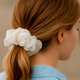 Белая резинка-скранч изготовлена из мягкого полиэстера. Размер 3x22 см позволяет создавать пышные пучки и свободные хвосты, а материал не травмирует волосы.